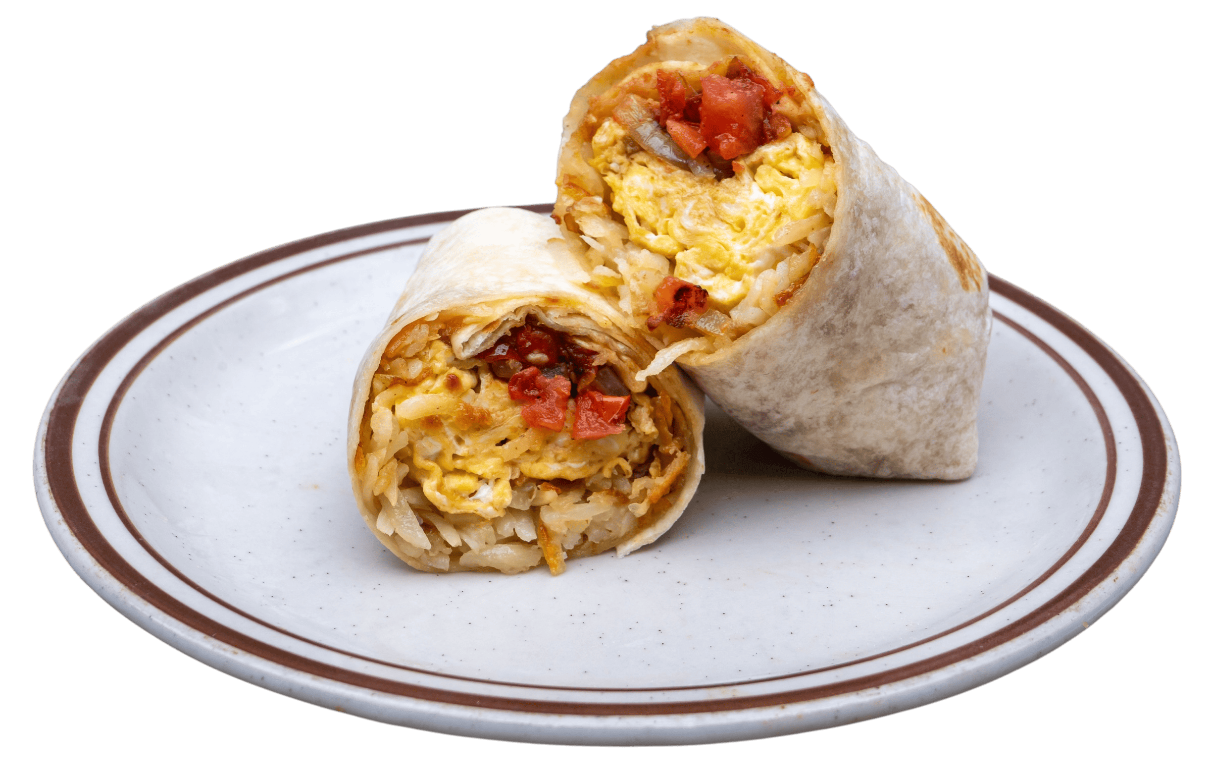 your choice of bacon, sausage, carnitas or veggie sausage, with shredded hashbrowns, scrambled eggs, cheddar, tomato, and onion in a tortilla wrap
