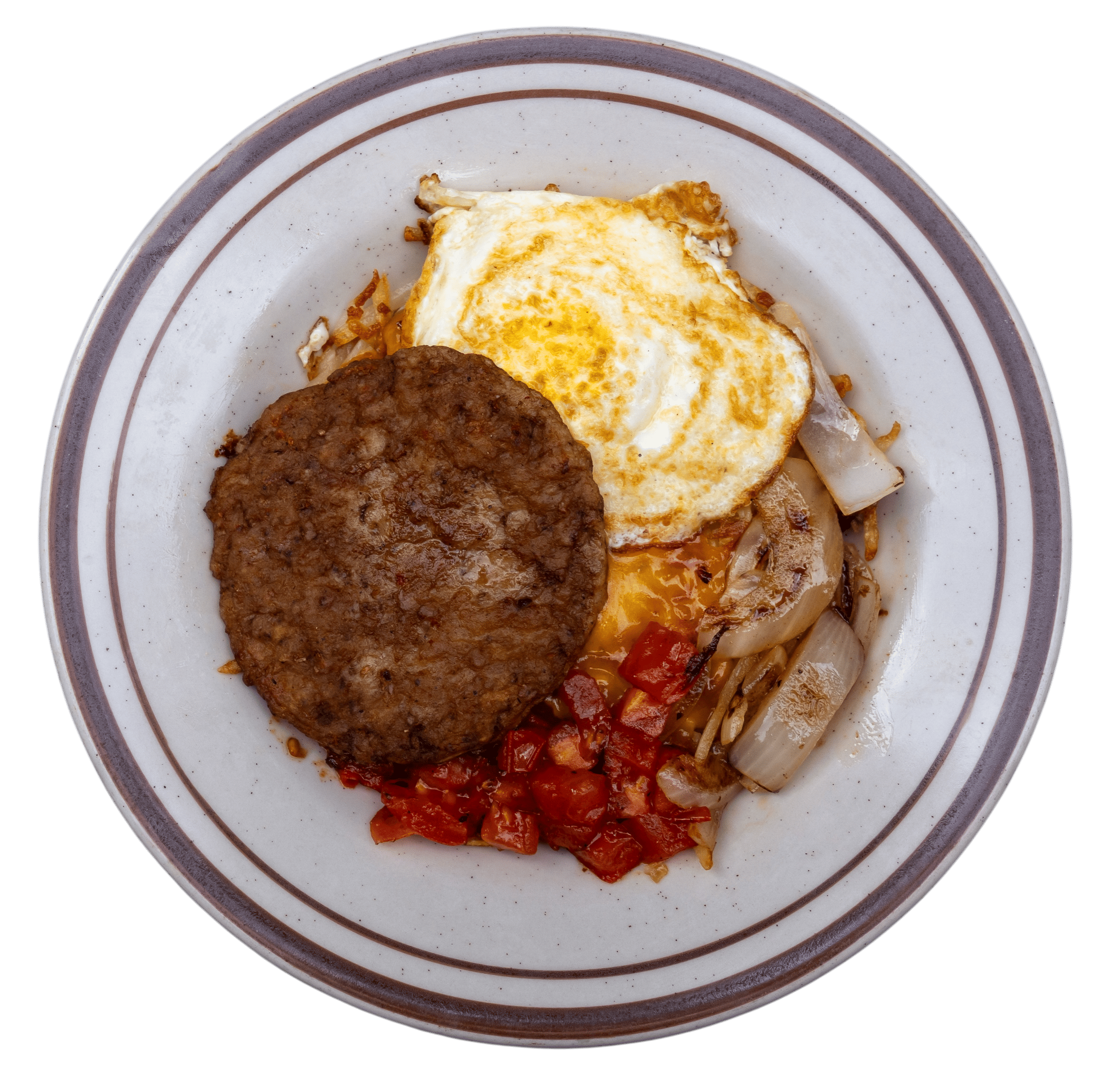 your choice of bacon, sausage, carnitas, or veggie sausage, with shredded hashbrowns, fried egg, tomato, and onion